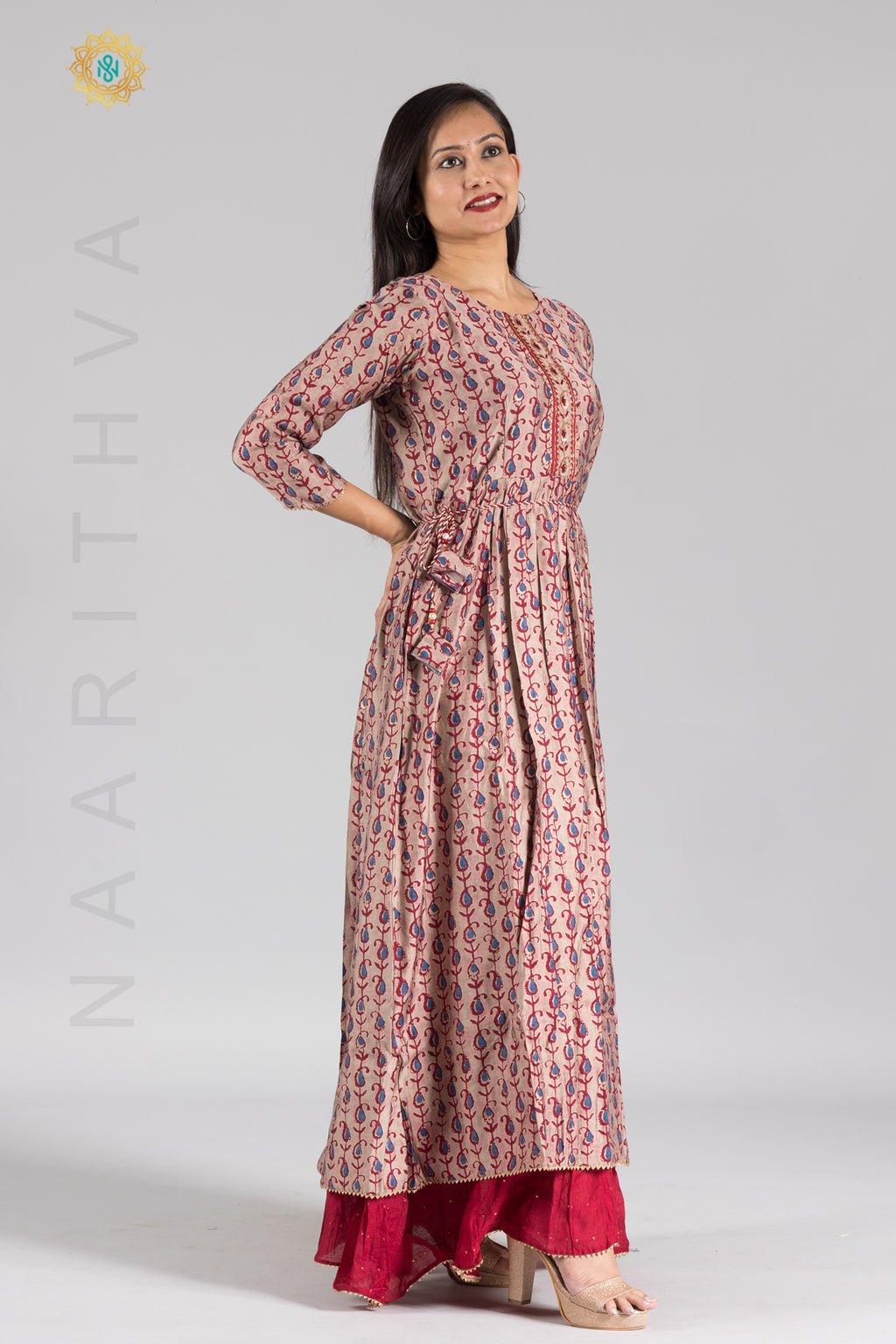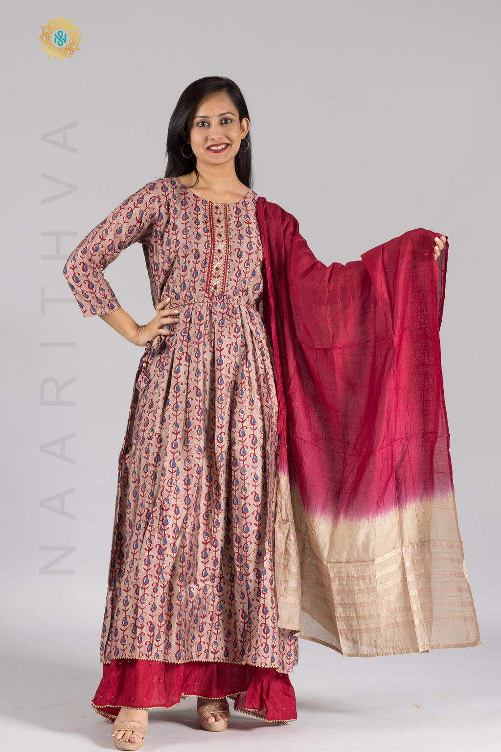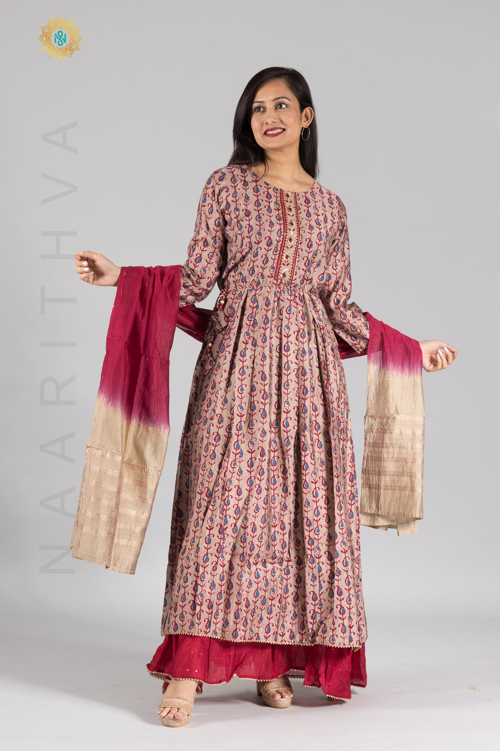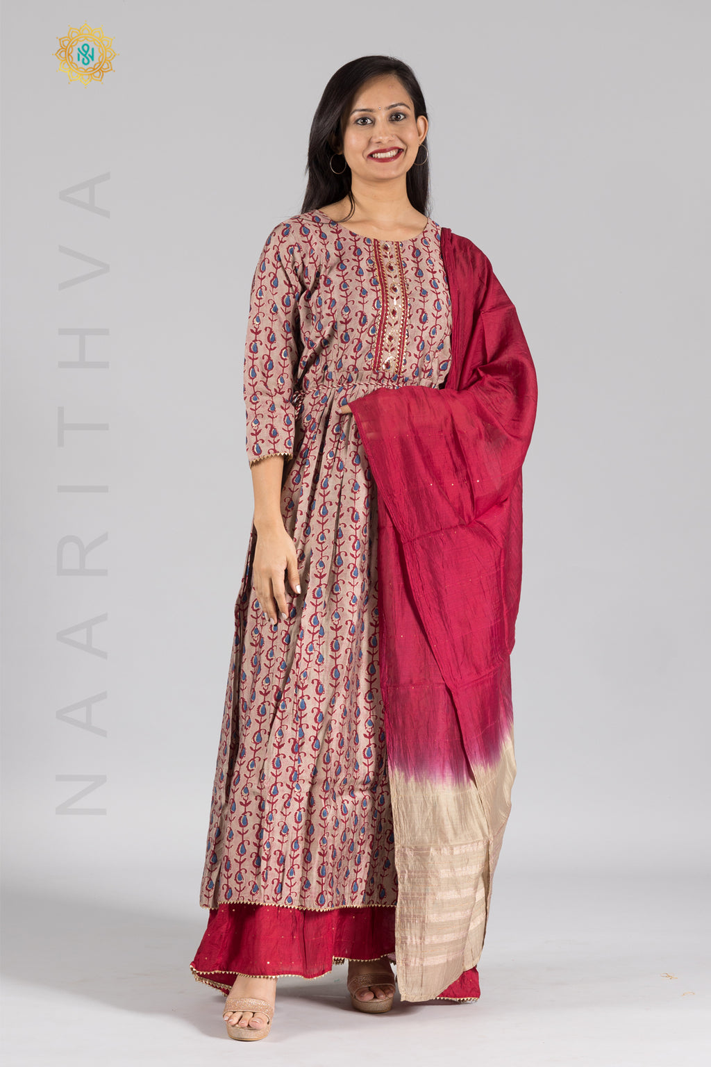 GREY WITH MAROON - PRINTED KURTI & DUPATTA WITH LAYERED FRILLED PATTERN