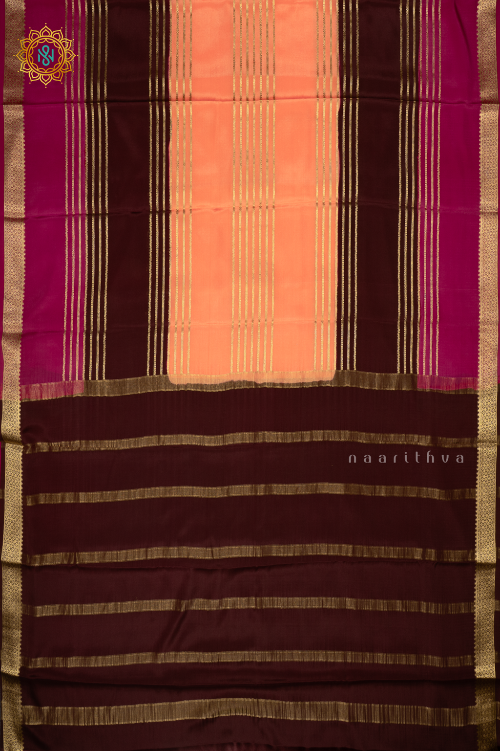 PEACH WITH BROWN AND MAGENTA - PURE MYSORE CREPE SILK