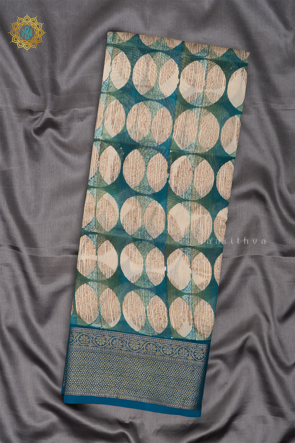 • Design : Printed Body With Zari Border, Pallu & Blouse
