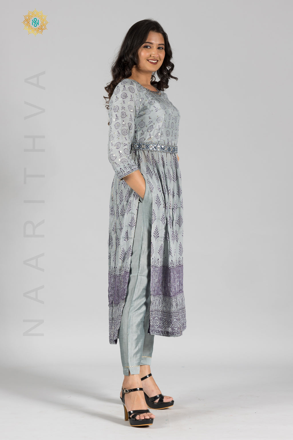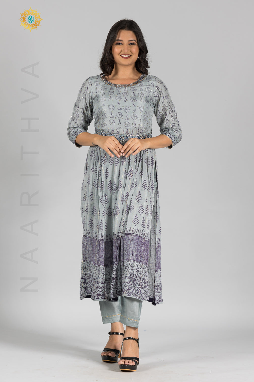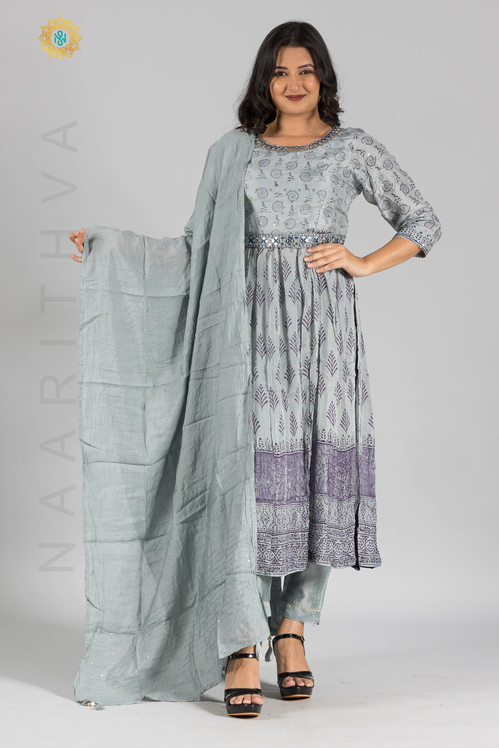 GREY - PRINTED NAYRA CUT SALWAR SUIT WITH STRAIGHT CUT PANT & DUPATTA