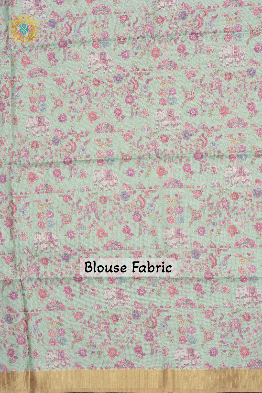 • Design : Printed Body With Contrast Border, Pallu & Blouse