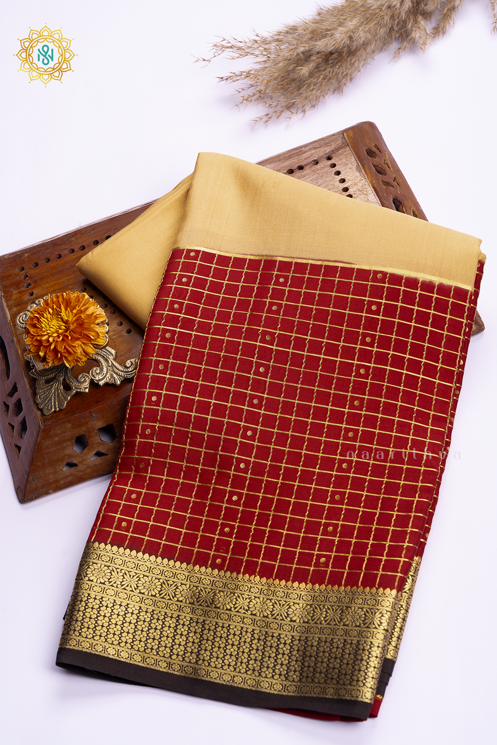 LIGHT BISCUIT WITH MAROON & BLACK - PURE MYSORE CREPE SILK