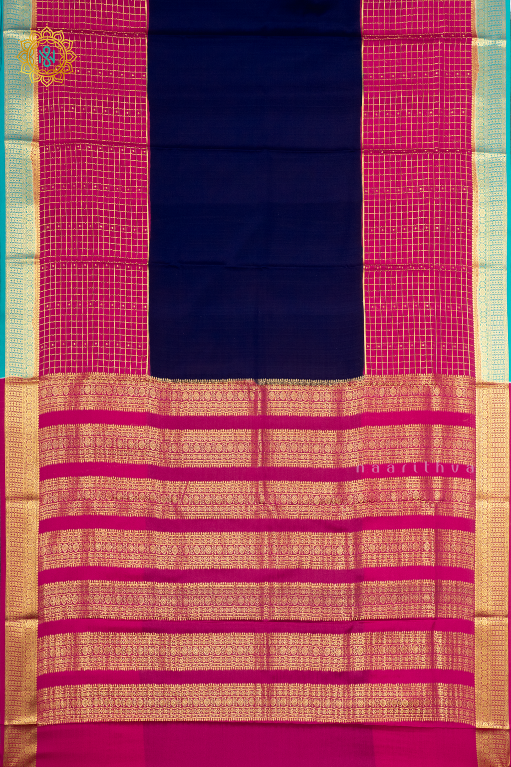 BLUE WITH PINK & SKY BLUE - PURE MYSORE CREPE SILK