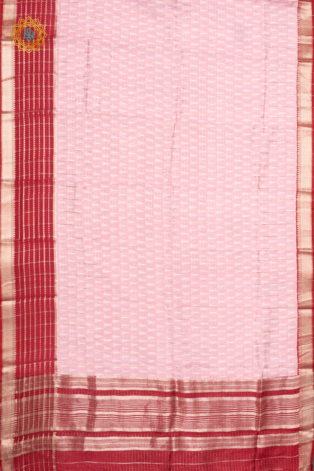 • Design : Zari Checks & Printed Body With Contrast Zari Border, Pallu & Blouse