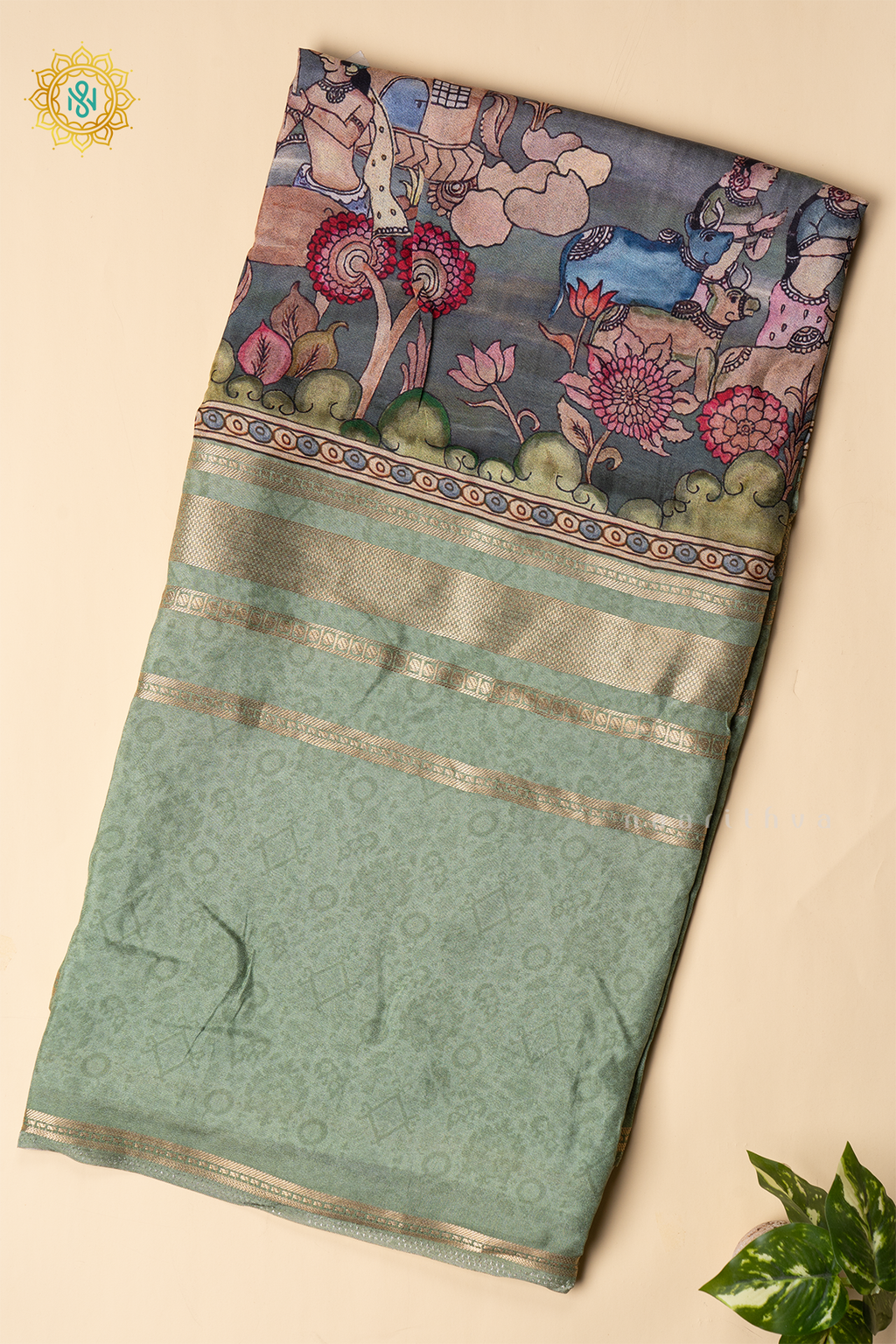 PISTA GREEN WITH GREY - SEMI CREPE SILK