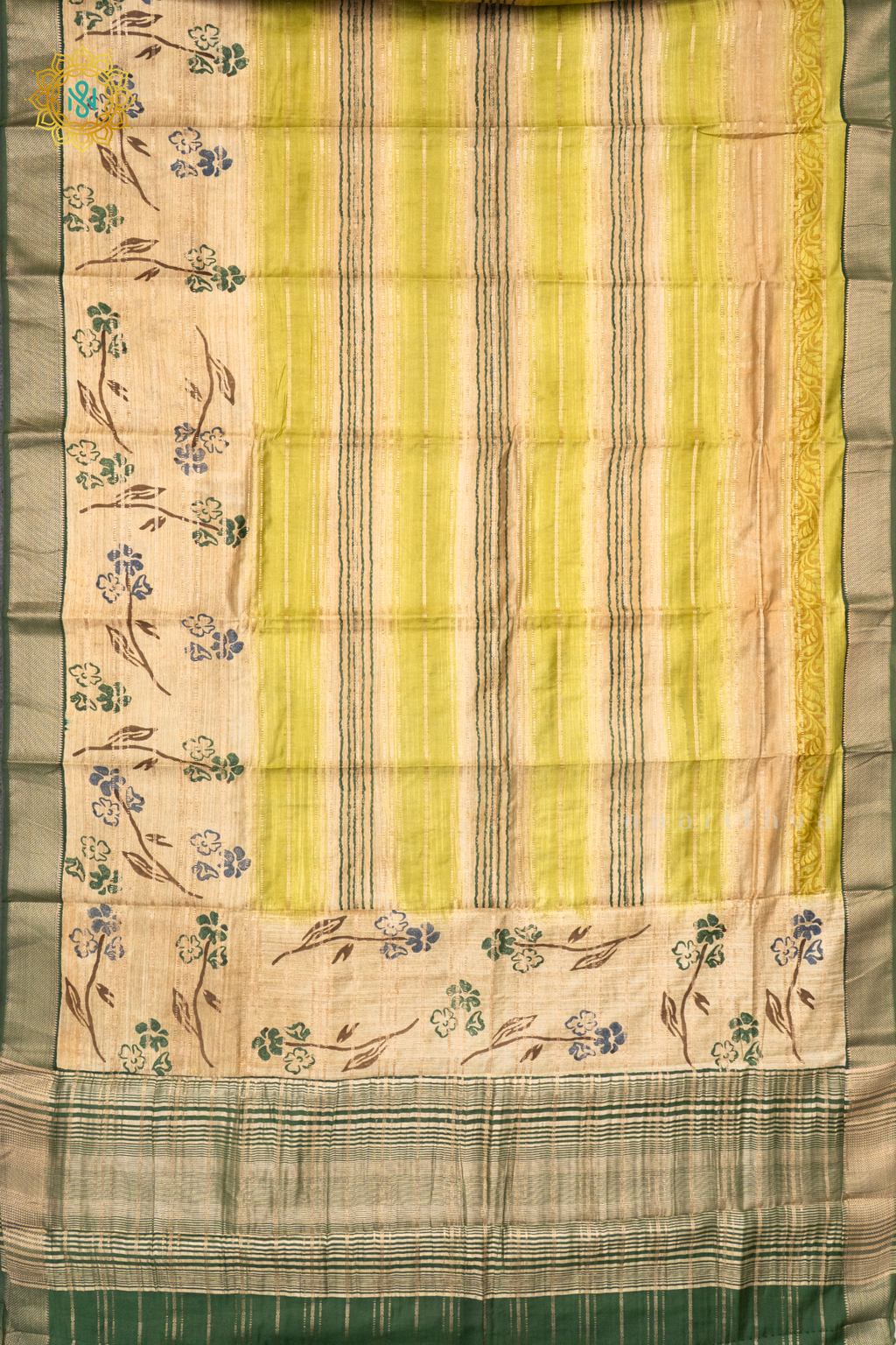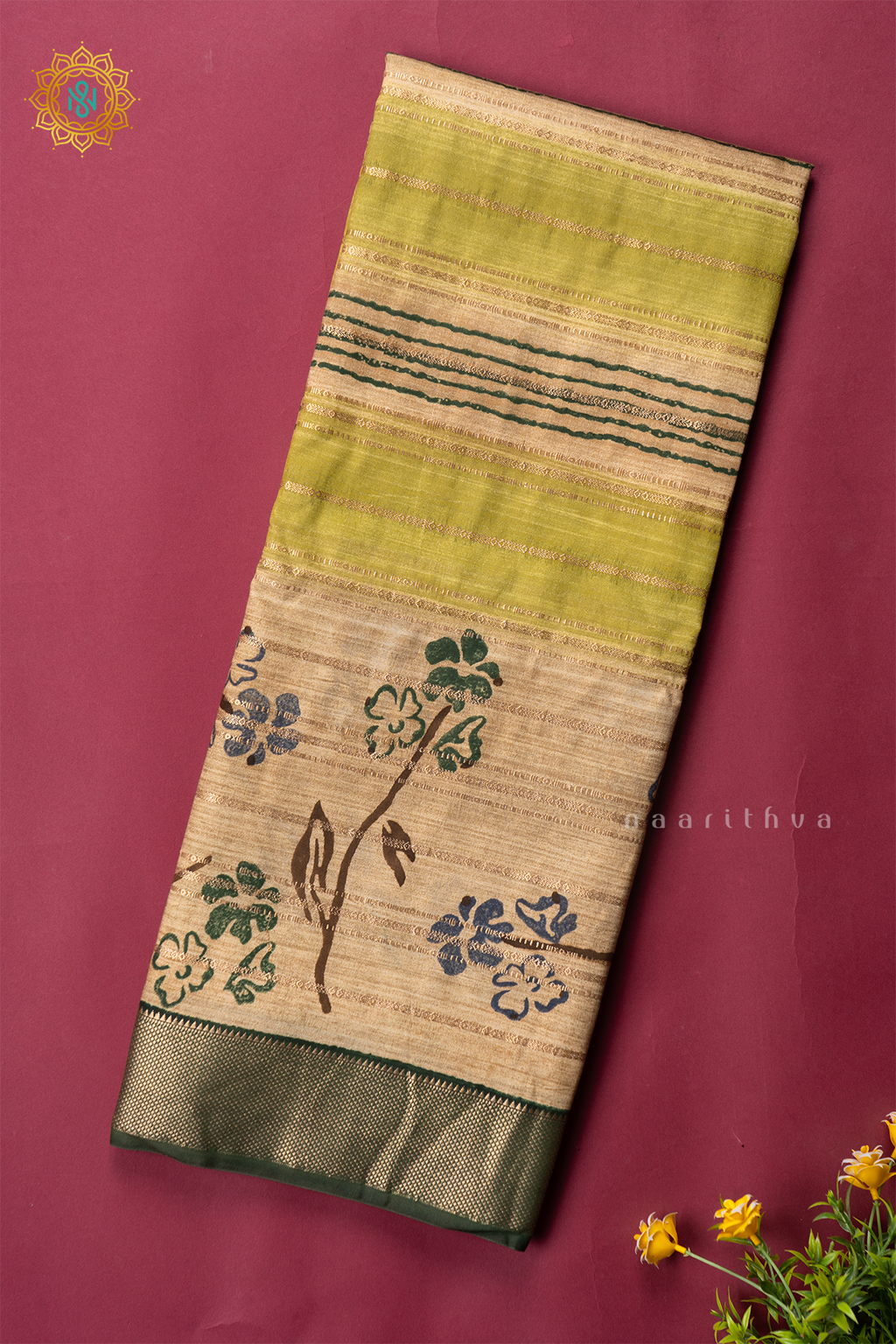 • Design : Zari Stripes & Printed Body With Contrast Zari Border, Pallu & Blouse