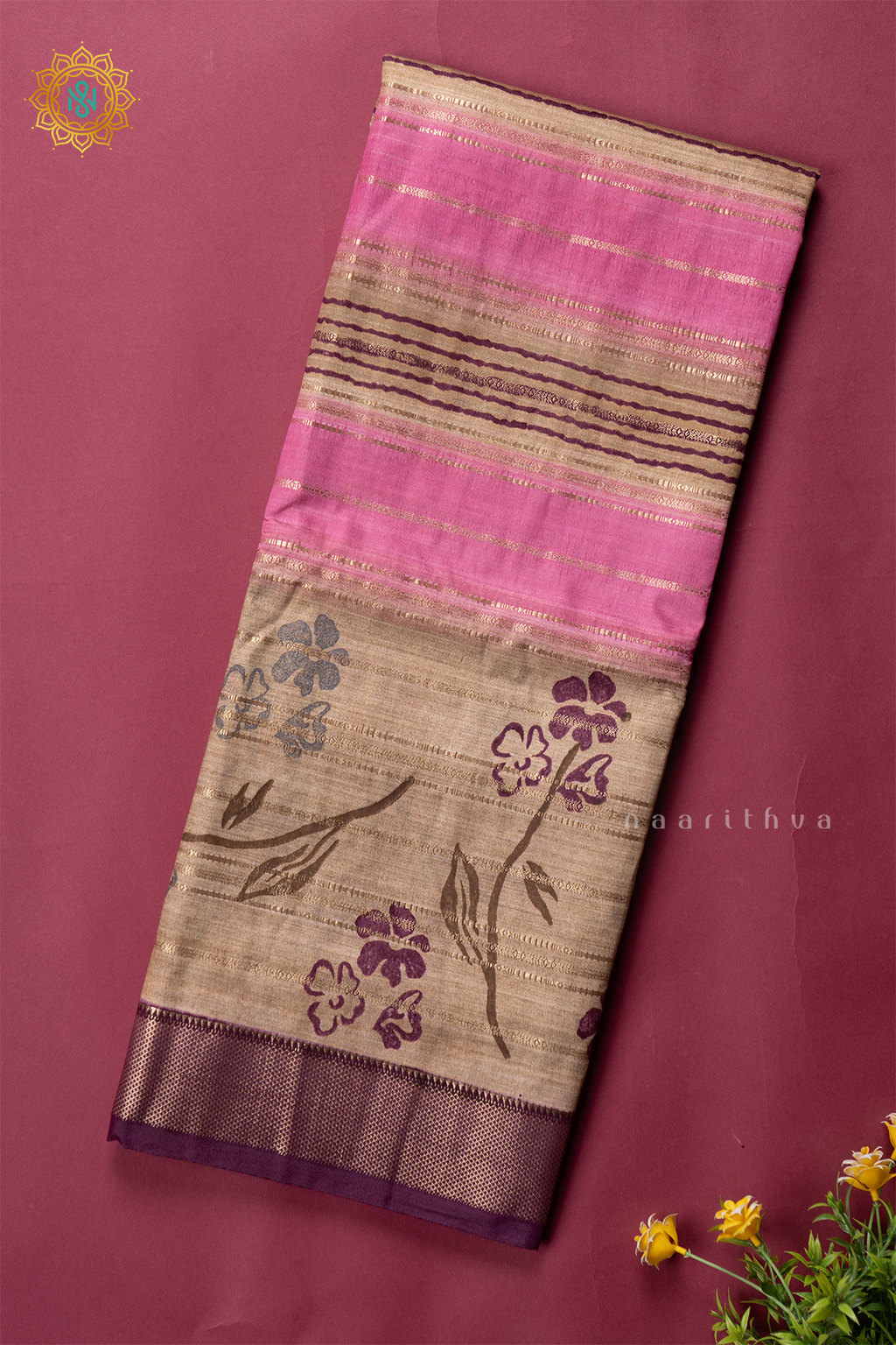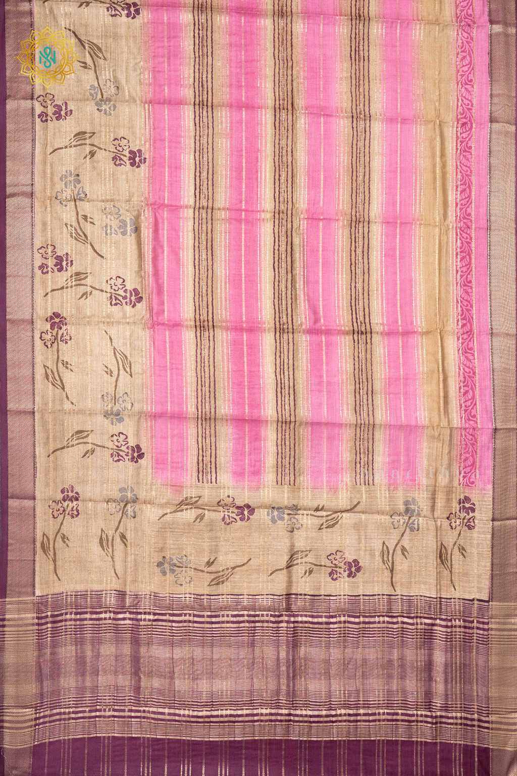 • Design : Zari Stripes & Printed Body With Contrast Zari Border, Pallu & Blouse