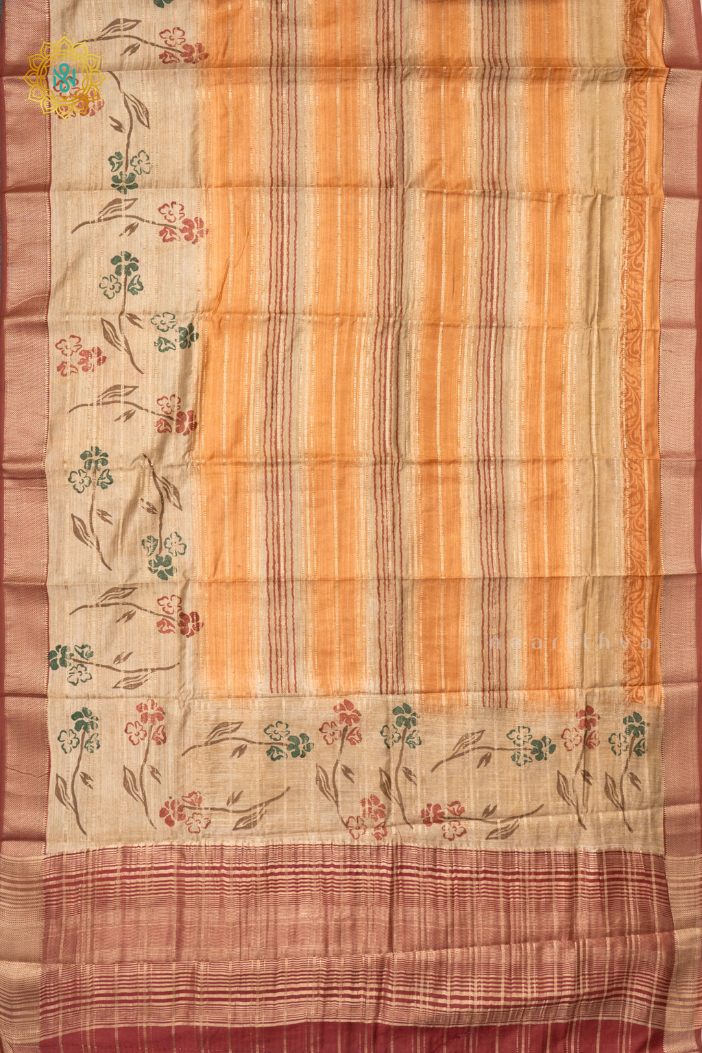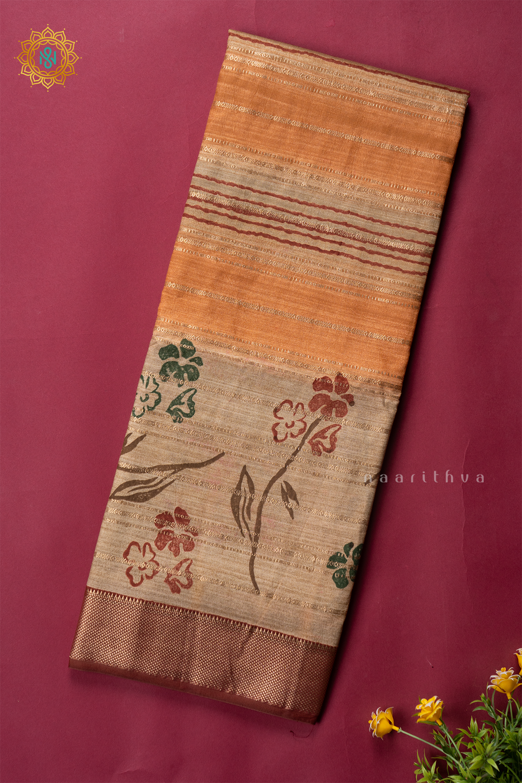 • Design : Zari Stripes & Printed Body With Contrast Zari Border, Pallu & Blouse