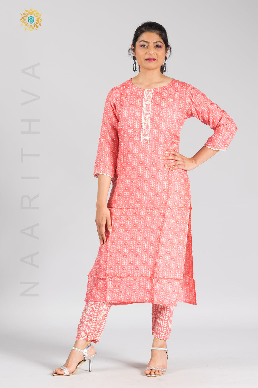 PEACH - PRINTED STRAIGHT CUT KURTI & BOTTOM SUIT