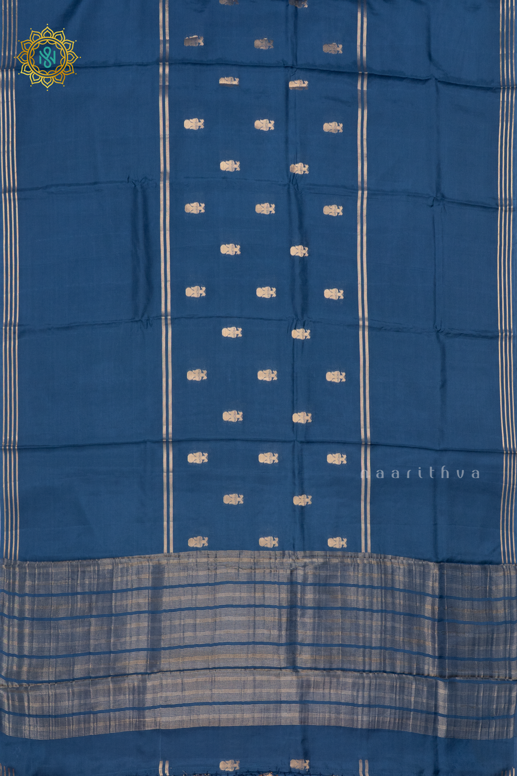 • Design : Gold Zari Buttas On The Body With Zari Line's Border, Pallu & Contrast Blouse