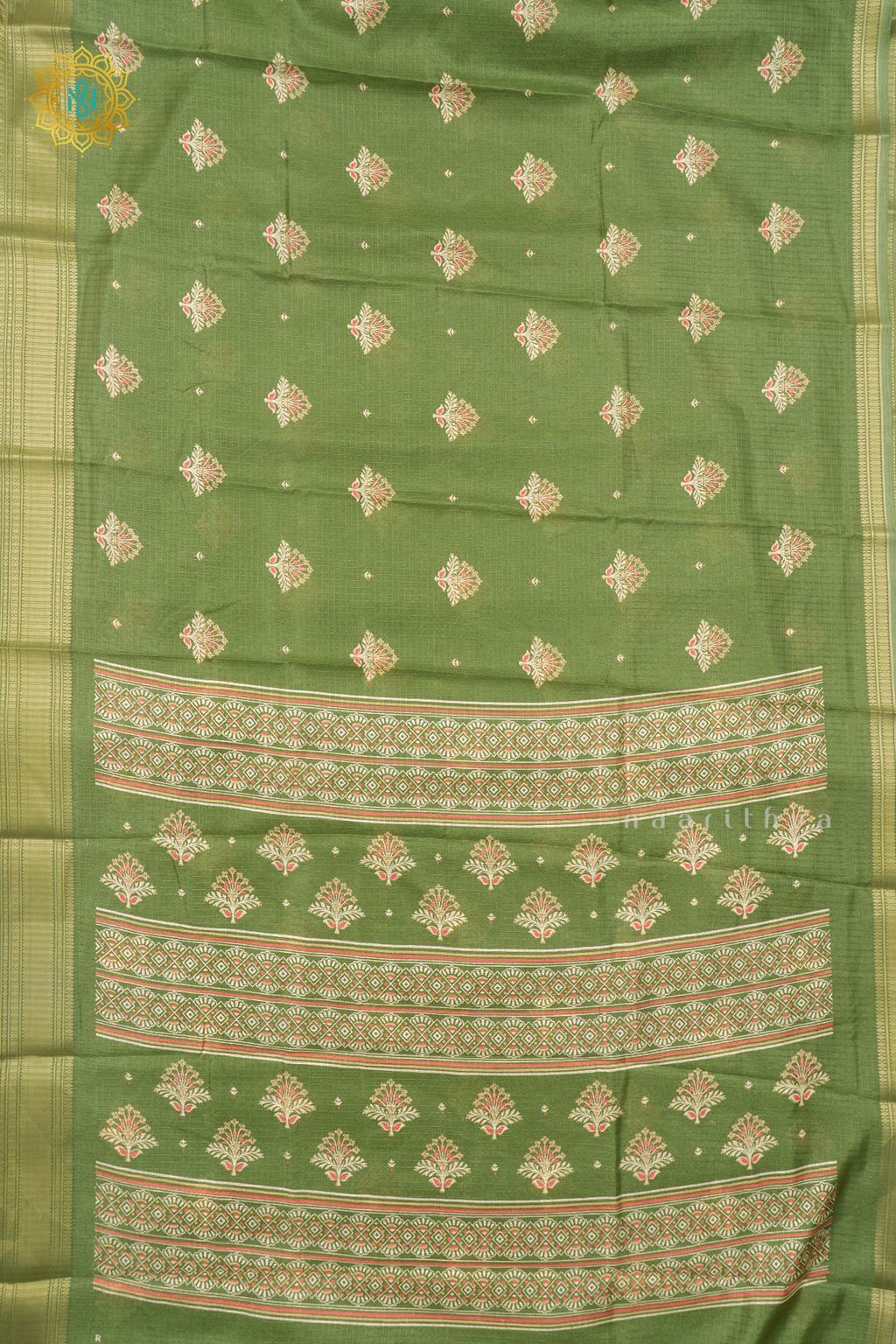 • Design : Printed Body With Zari Border, Pallu & Blouse