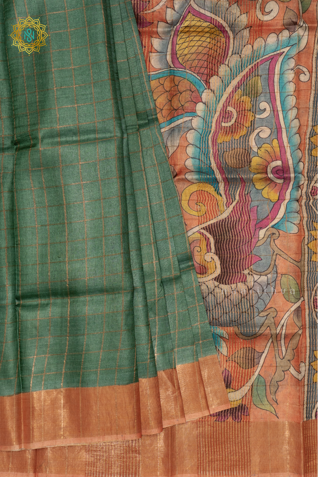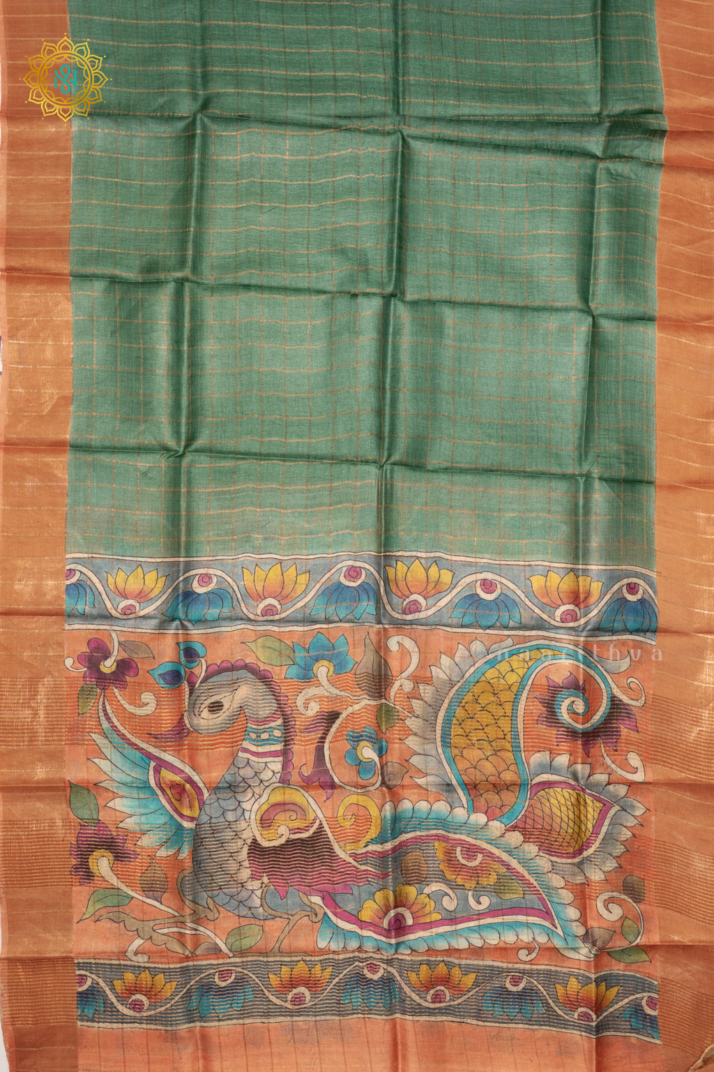 GREEN WITH PEACH - PURE TUSSAR SILK