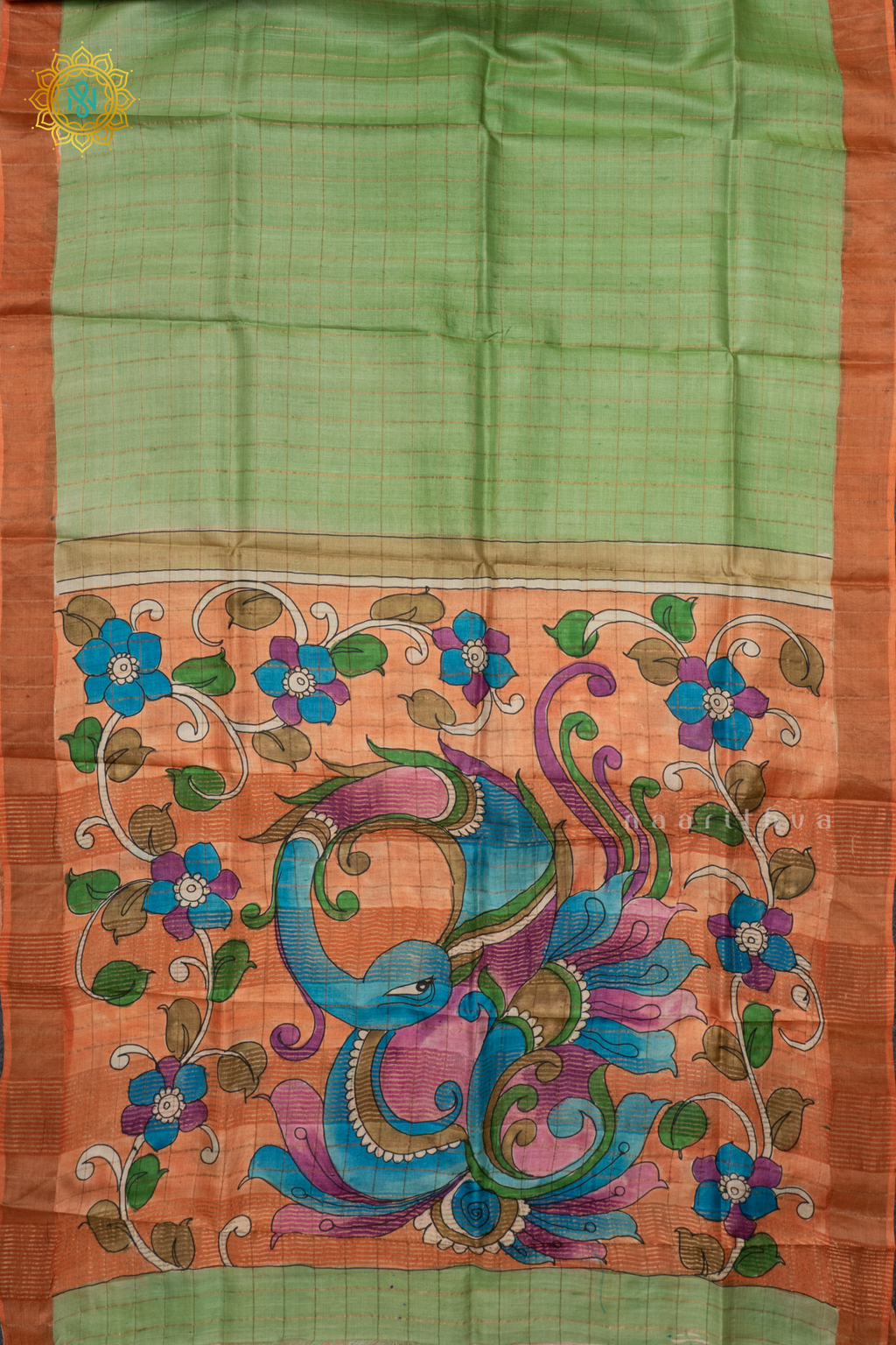 PISTA GREEN WITH RUST ORANGE - PURE TUSSAR SILK