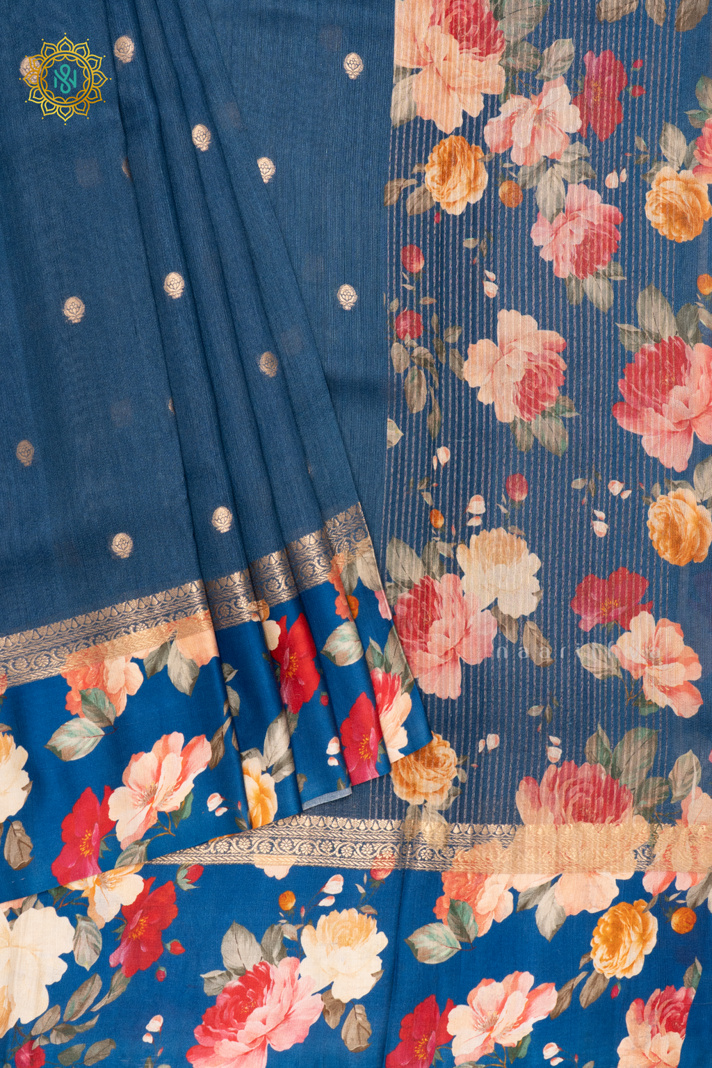• Design : Zari Buttas On The Body With Satin DIgital Printed Border, Pallu & Blouse