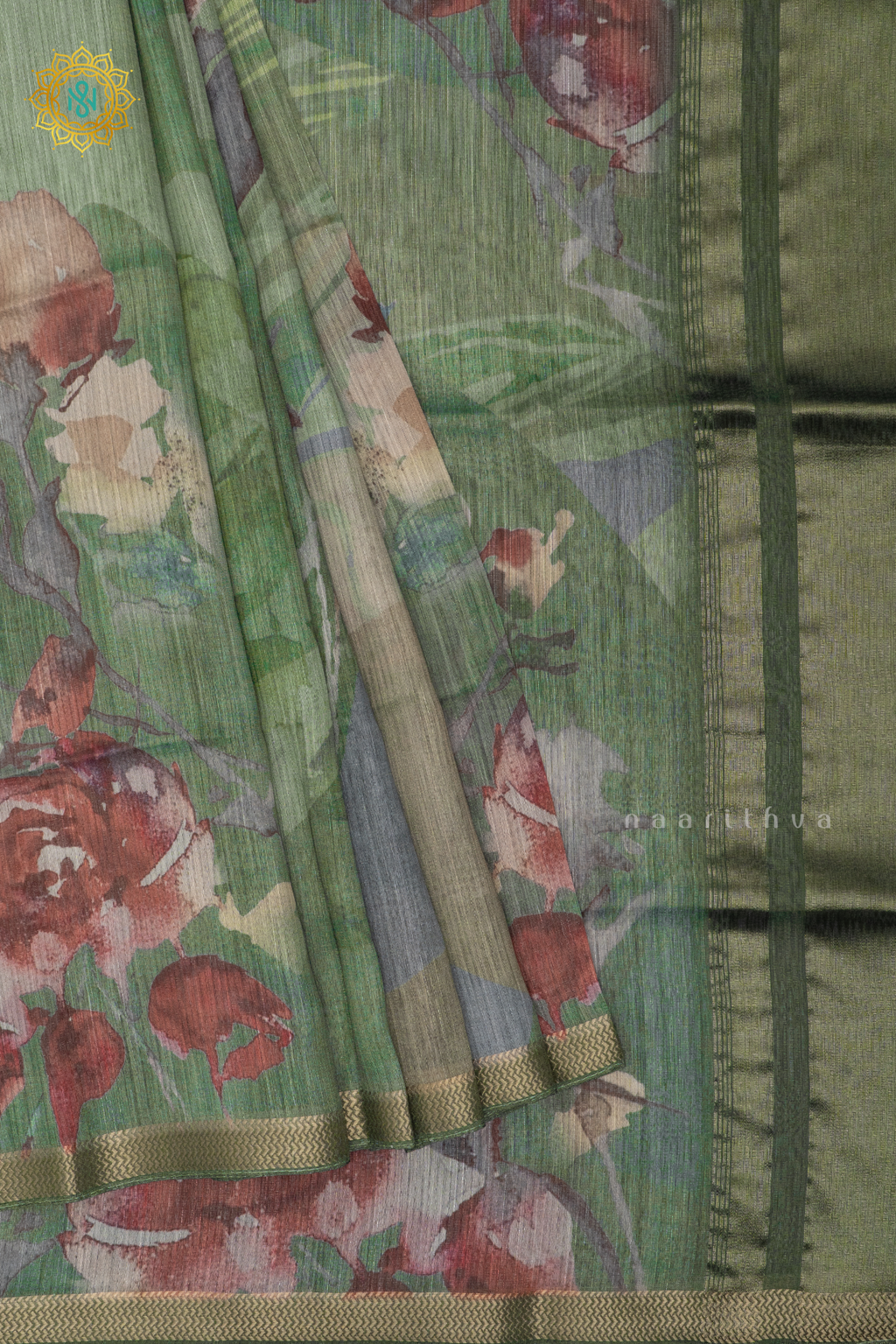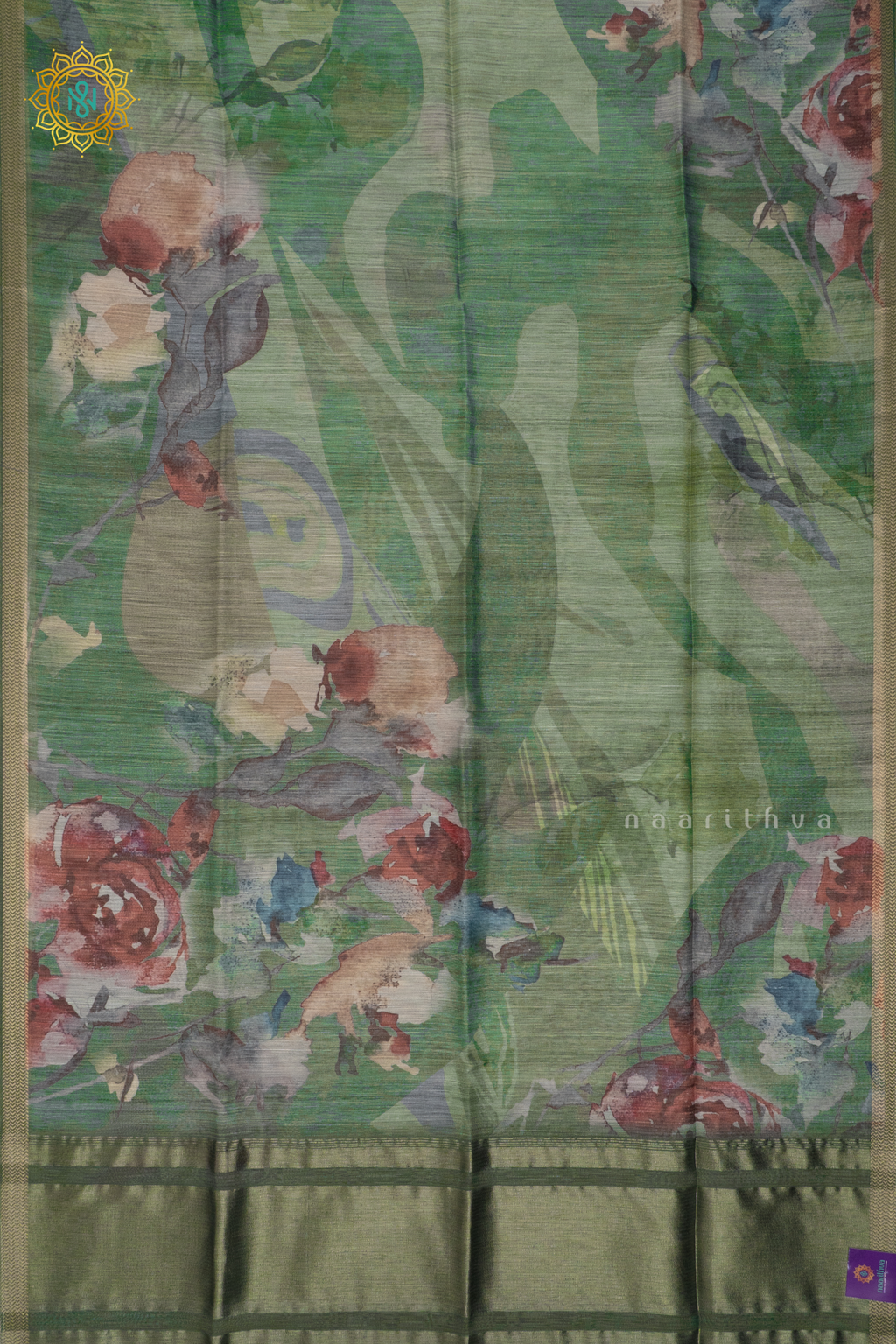 • Design : Printed Body With Zari Border, Pallu & Blouse