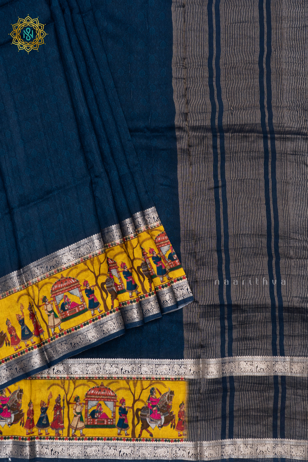 PEACOCK BLUE WITH YELLOW - SEMI CREPE SILK