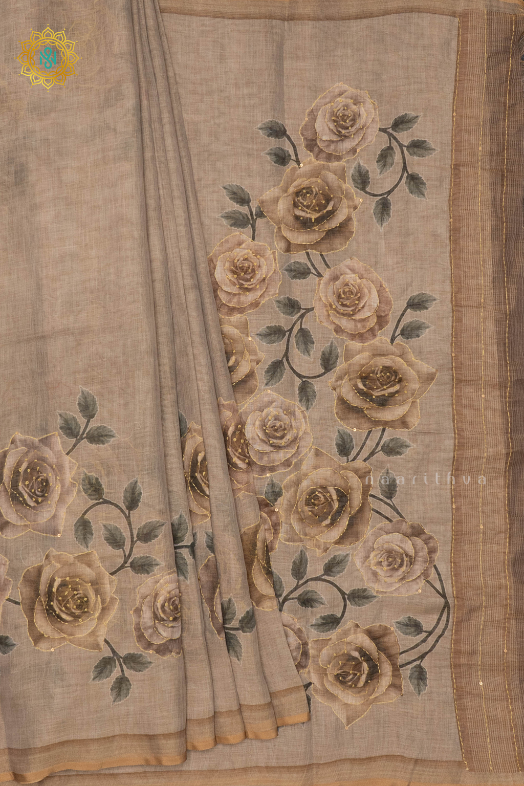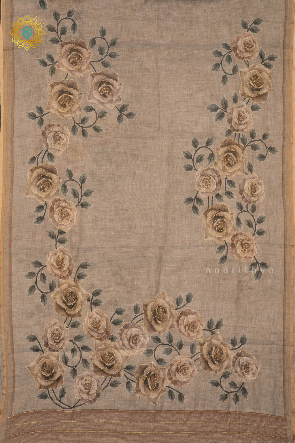• Design : Katha Work With Printed Body, Pallu & Blouse.