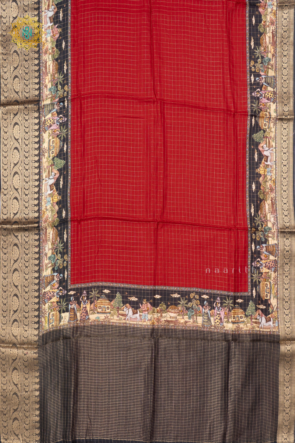 • Design : Zar Checks & Printed Body With Contrast Zari Border, Pallu & Blouse