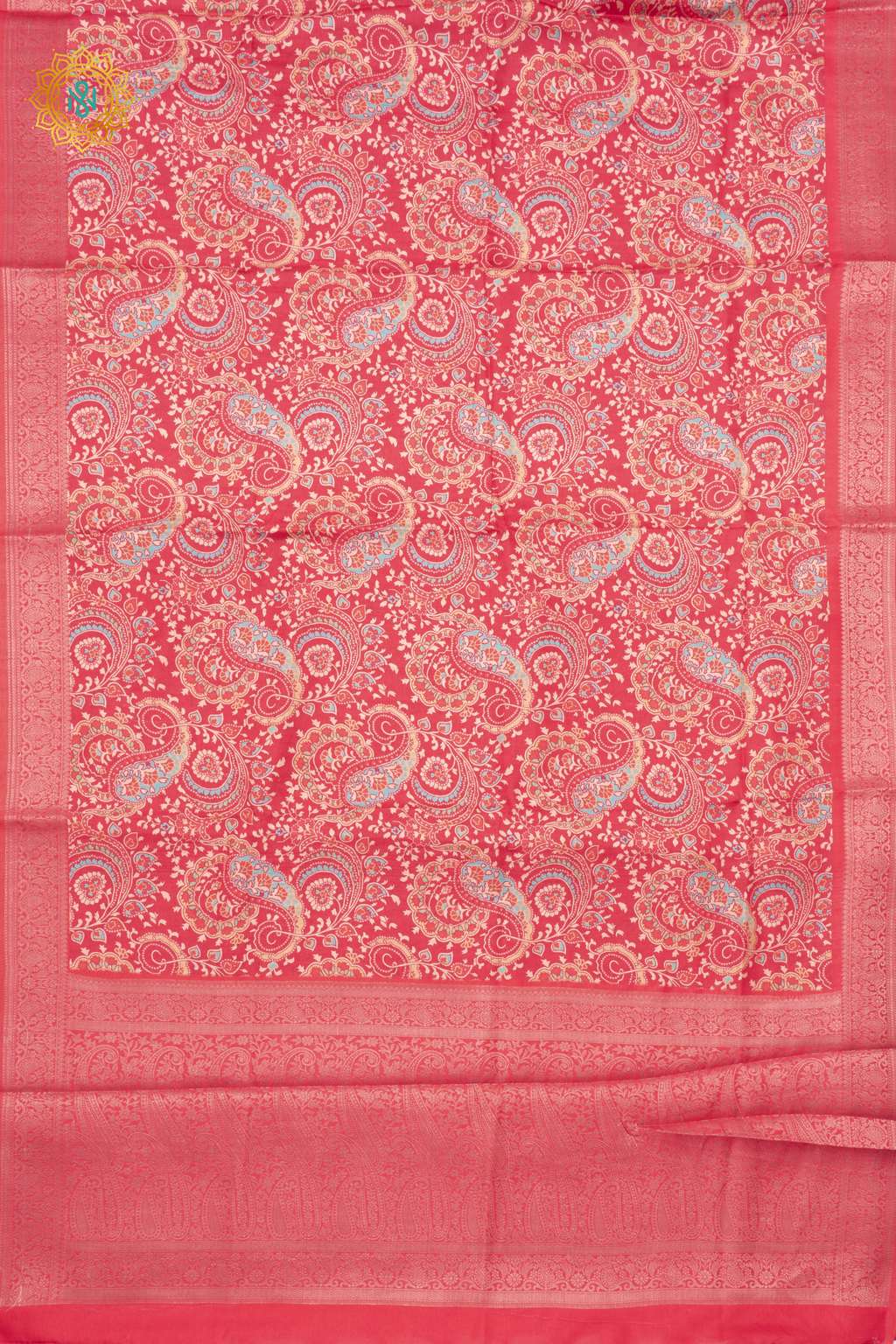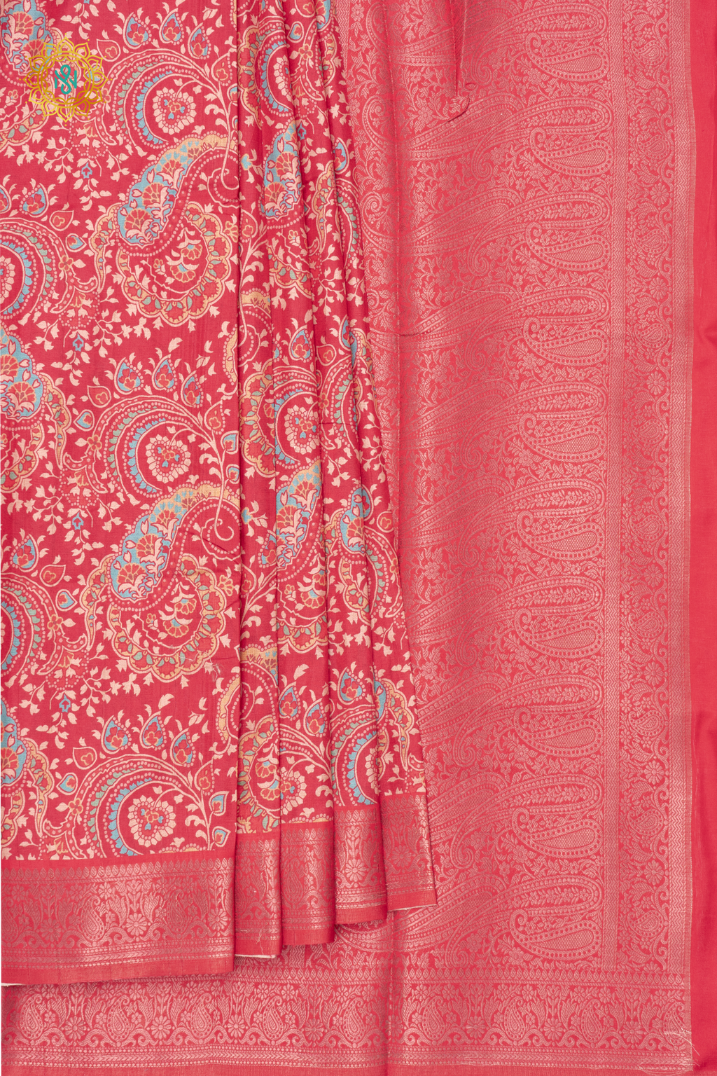 • Design : Printed Body With Contrast Zari Border, Pallu & Blouse
