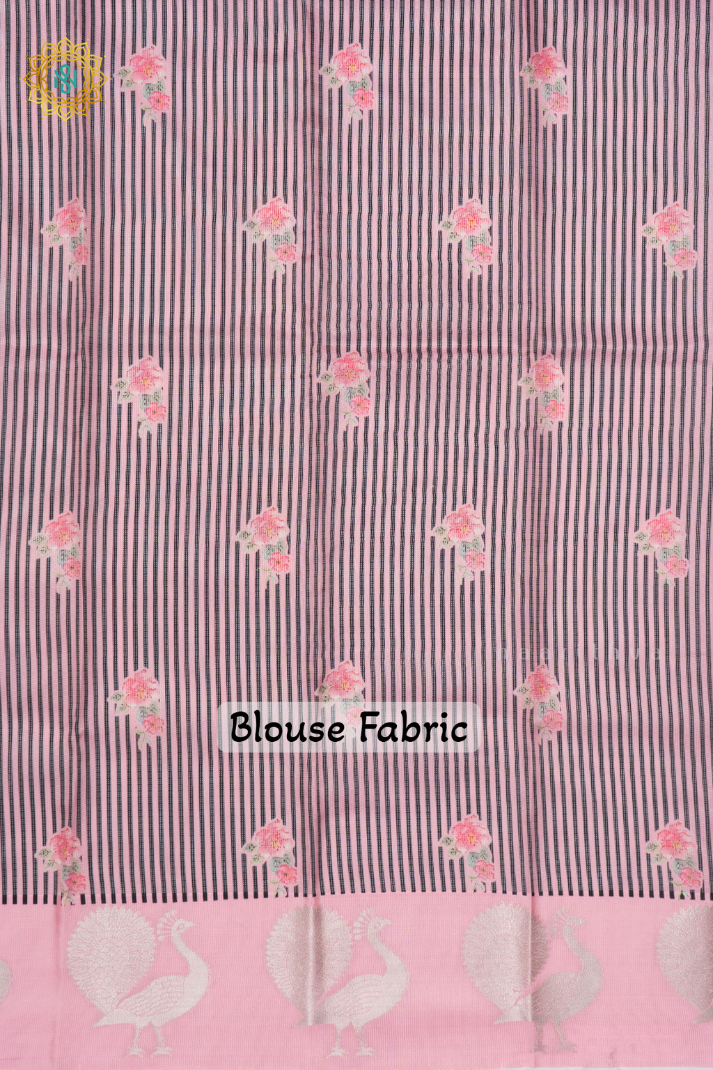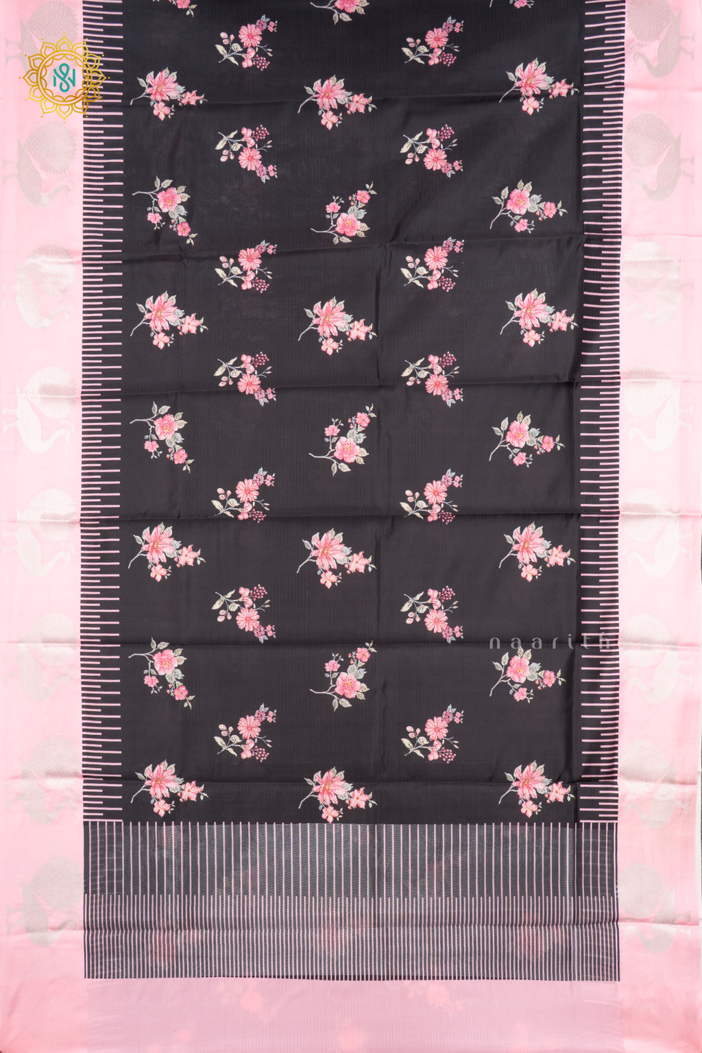 • Design : Printed Body With Contrast Satin Border, Pallu & Blouse