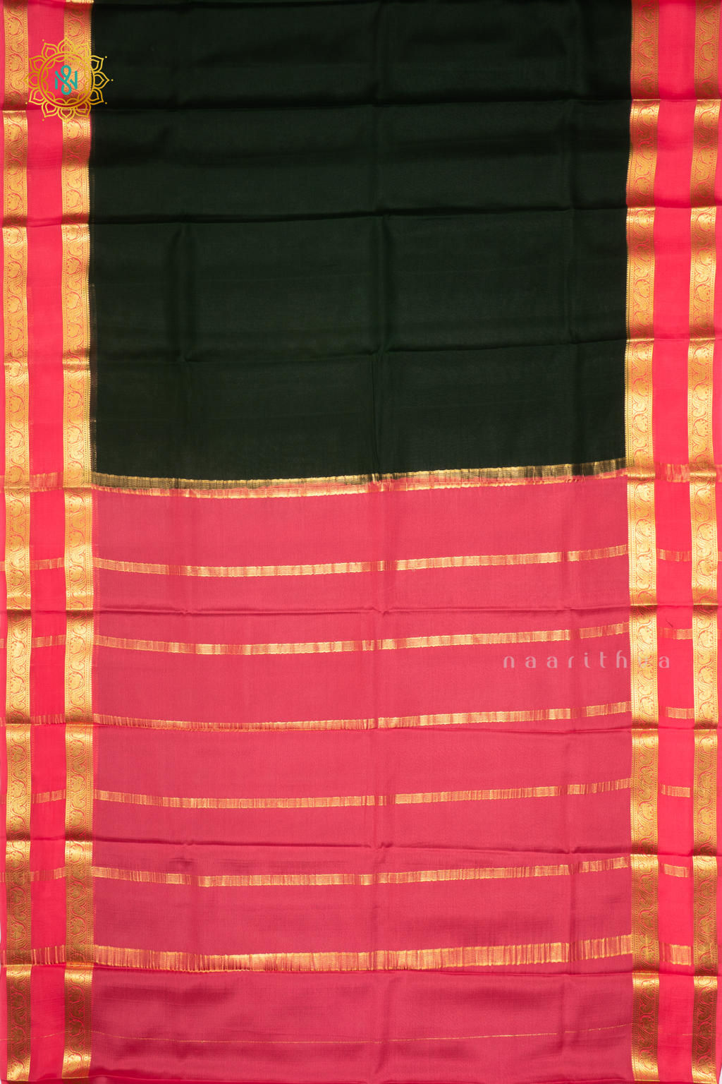 BOTTLE GREEN WITH PEACHISH PINK - PURE MYSORE CREPE SILK