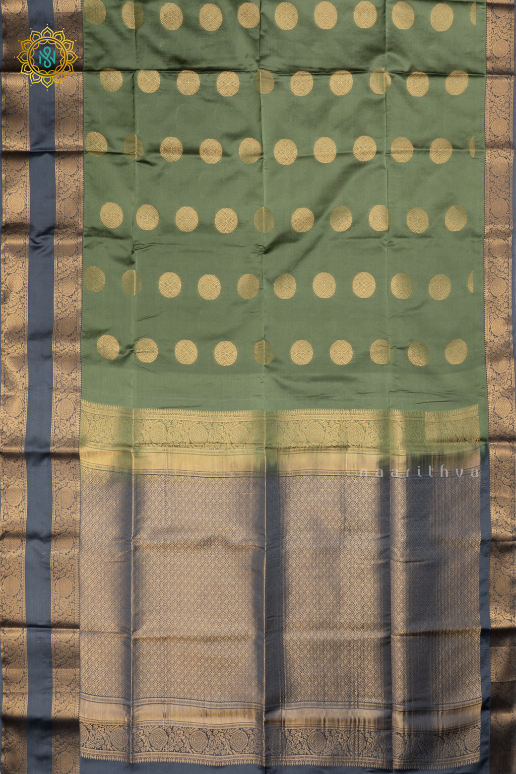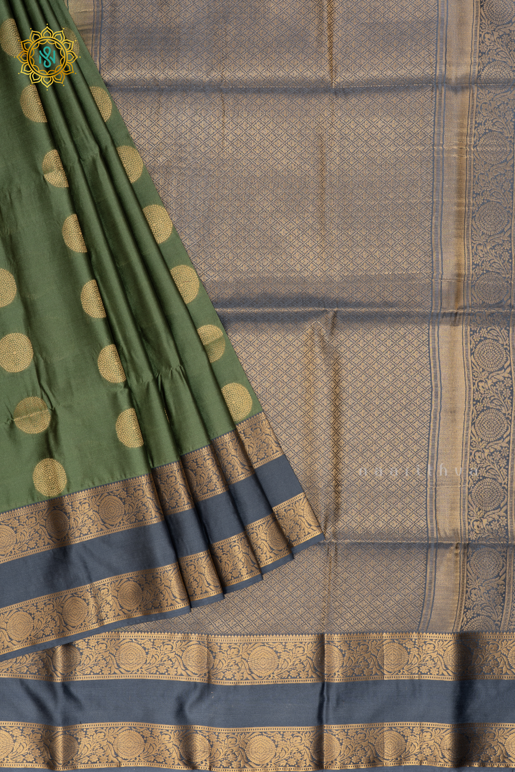 GREEN WITH GREYISH BLUE - SEMI SOFT SILK SAREE ALLOVER ZARI BUTTAS AND CONTRAST GAP BORDER