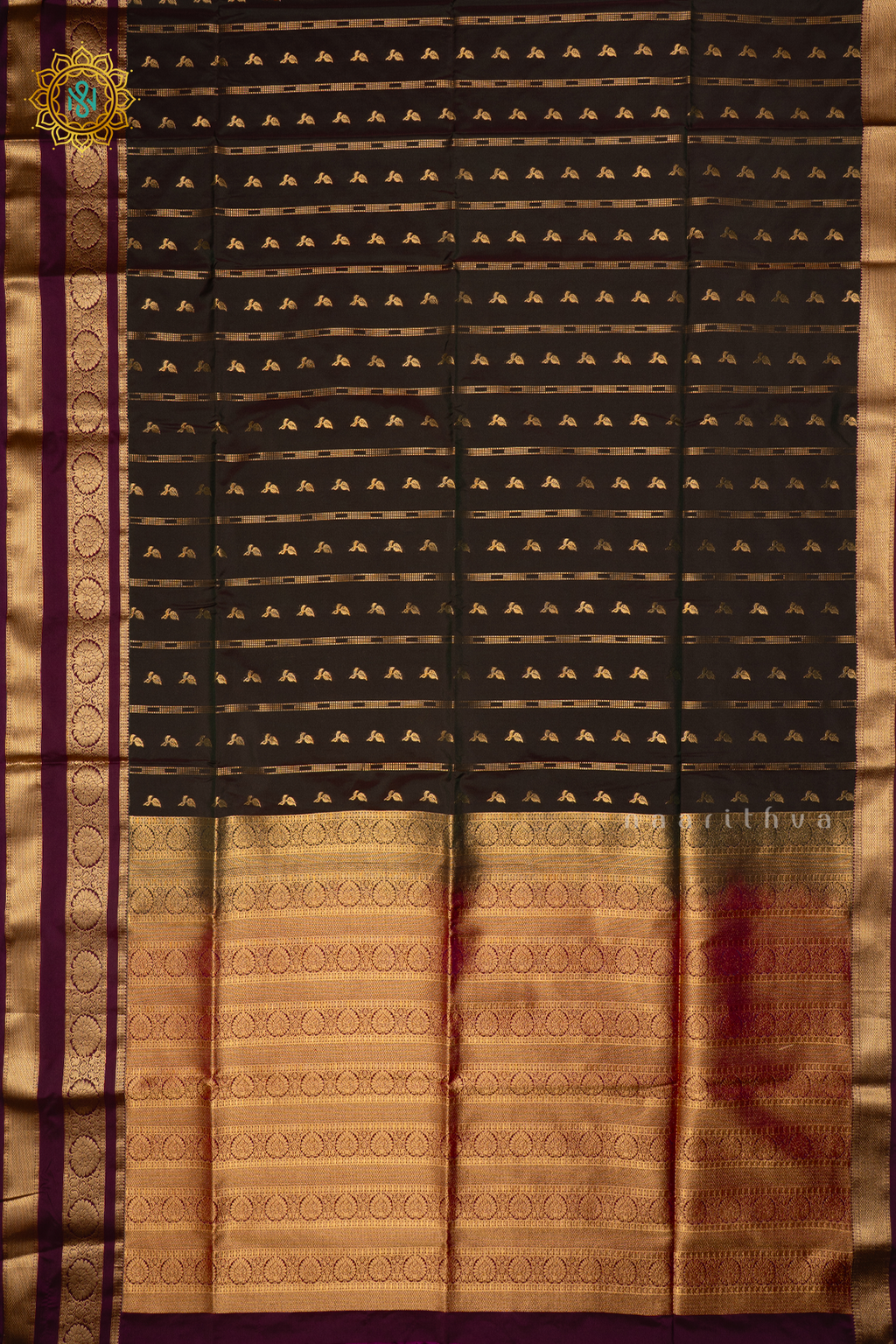 GREY WITH MAGENTA - SEMI SOFT SILK SAREE ALLOVER ZARI BUTTAS AND CONTRAST GAP BORDER