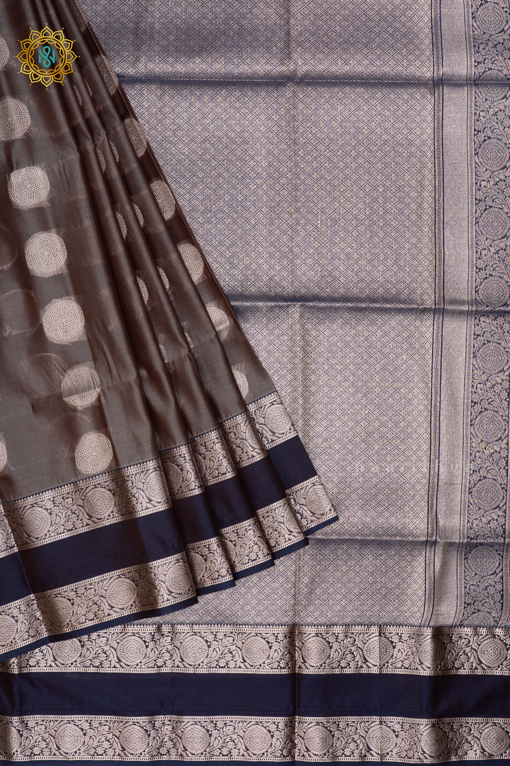GREY WITH NAVY BLUE- SEMI SOFT SILK SAREE ALLOVER ZARI BUTTAS AND CONTRAST GAP BORDER