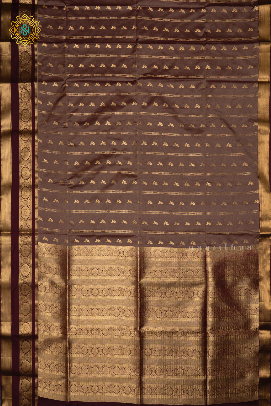 LIGHT BROWN WITH CHOCOLATE BROWN - SEMI SOFT SILK SAREE ALLOVER ZARI BUTTAS AND CONTRAST GAP BORDER
