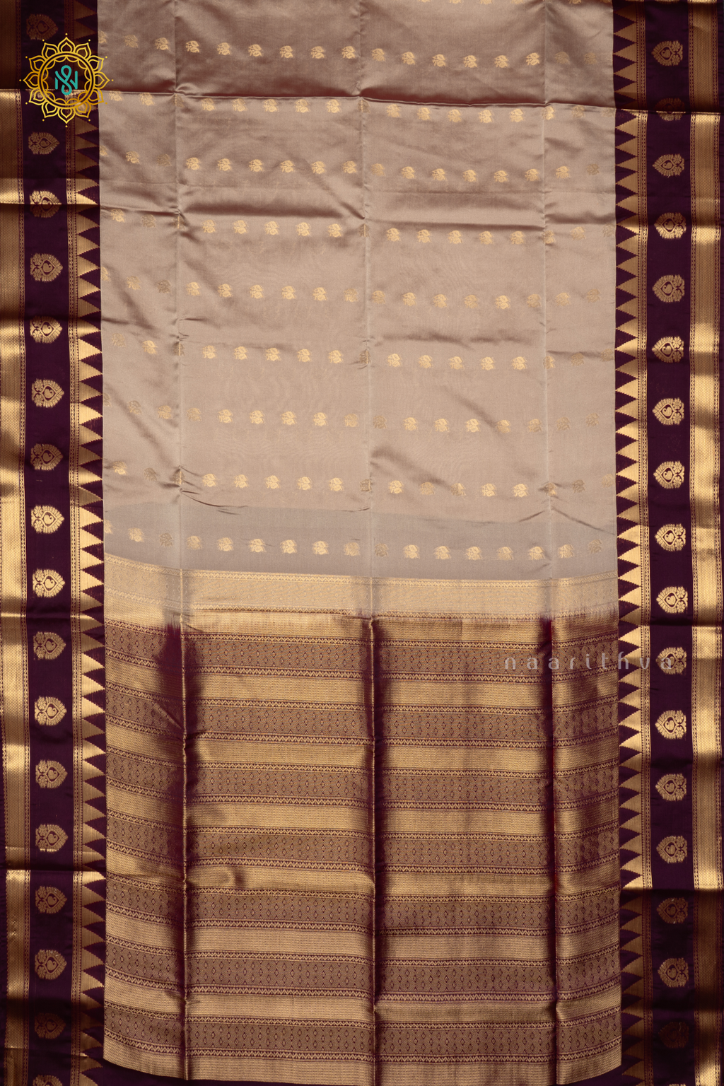LIGHT GREY WITH DEEP WINE - SEMI SOFT SILK SAREE ALLOVER ZARI BUTTAS AND CONTRAST TEMPLE RISING GAP BORDER