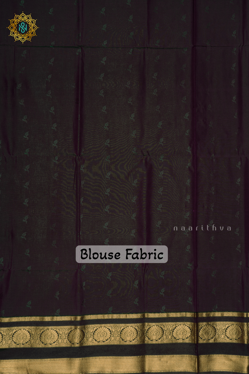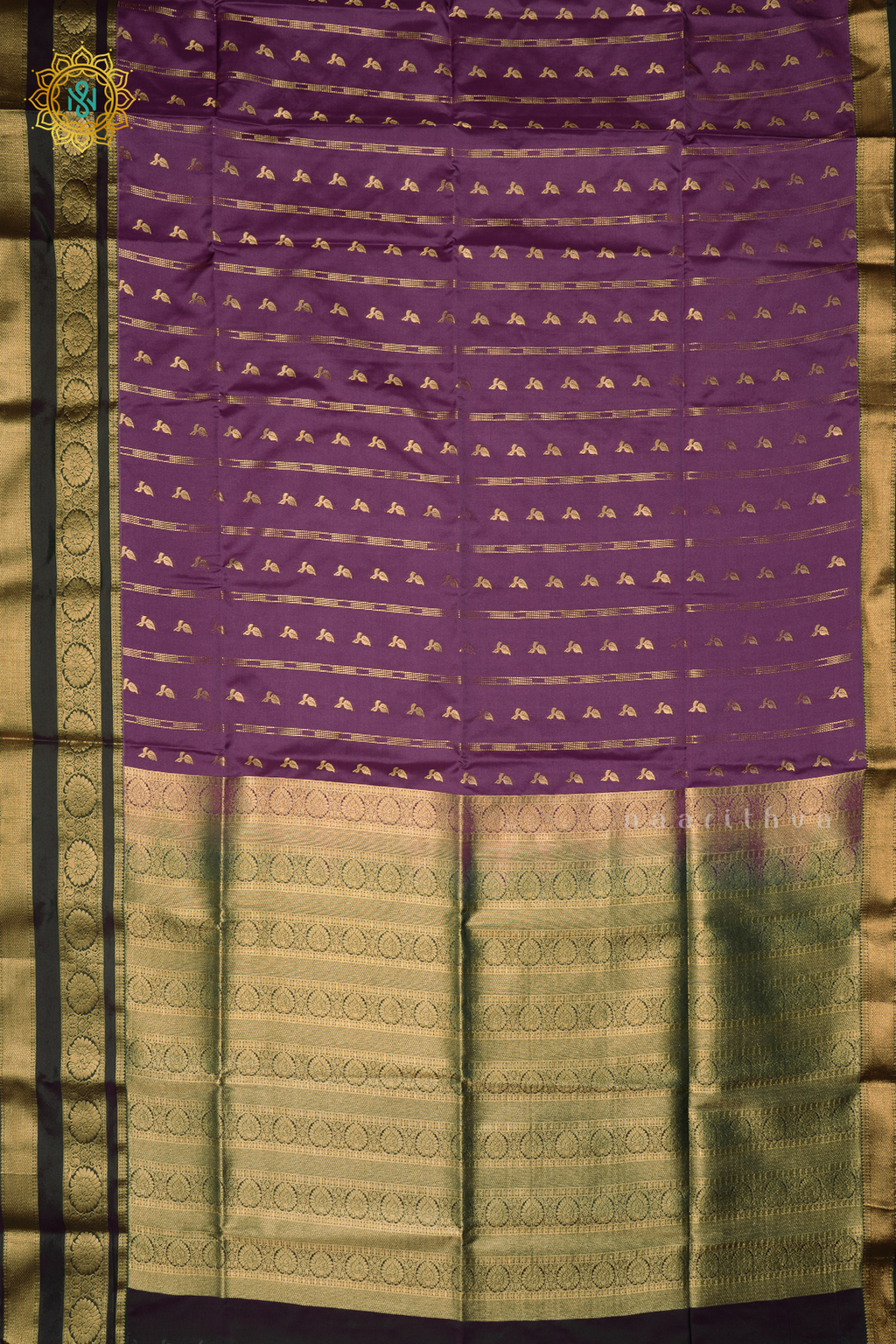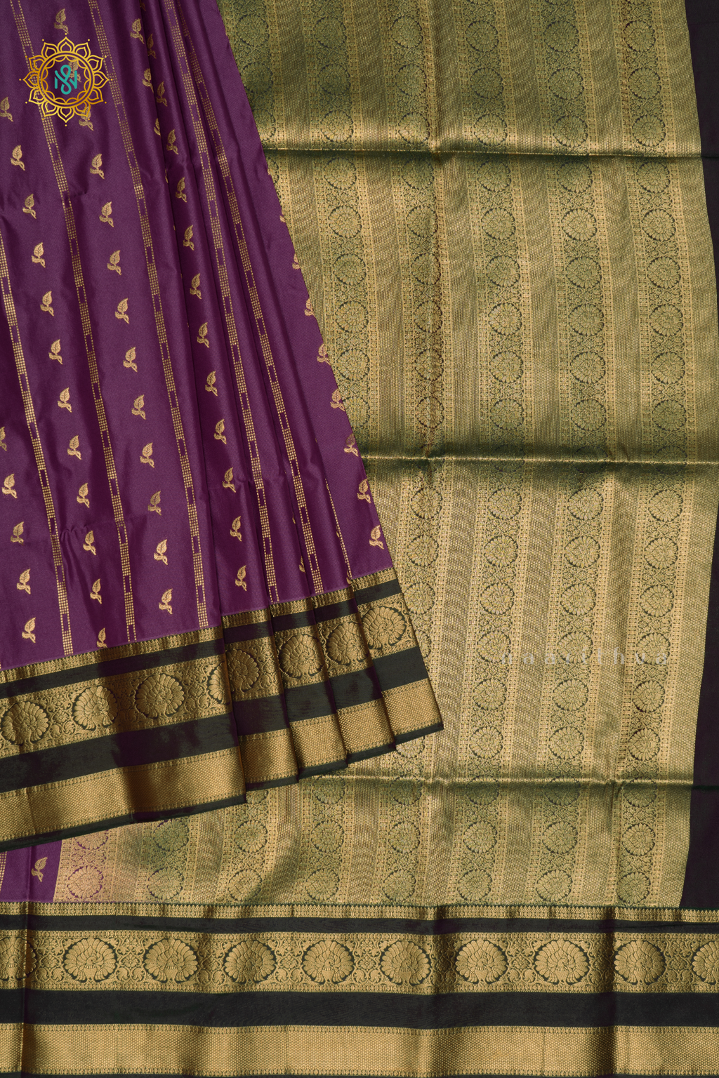 PURPLE WITH DUAL SHADE OF GREEN - SEMI KANCHI SAREE ALLOVER ZARI BUTTAS AND CONTRAST GAP BORDER
